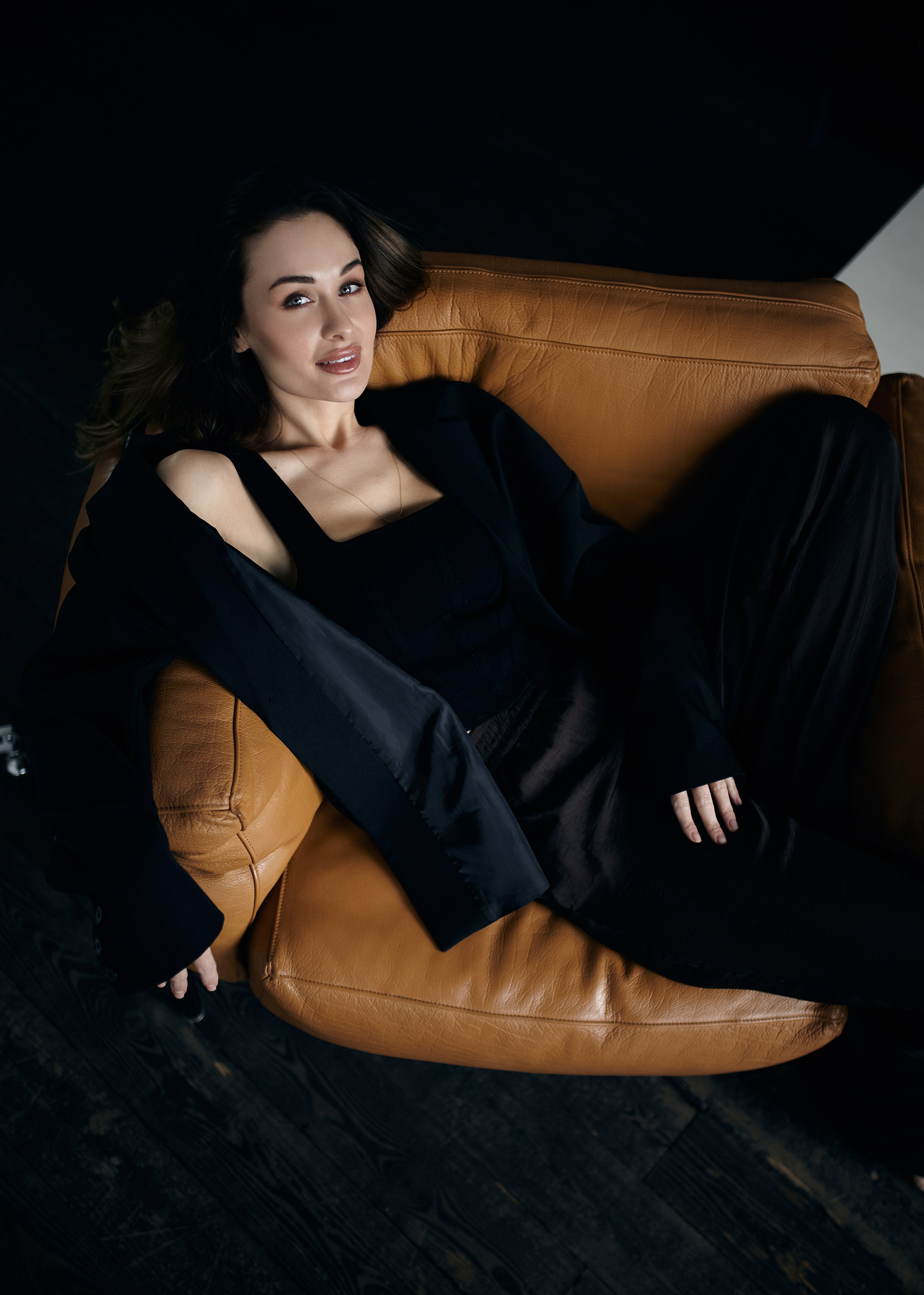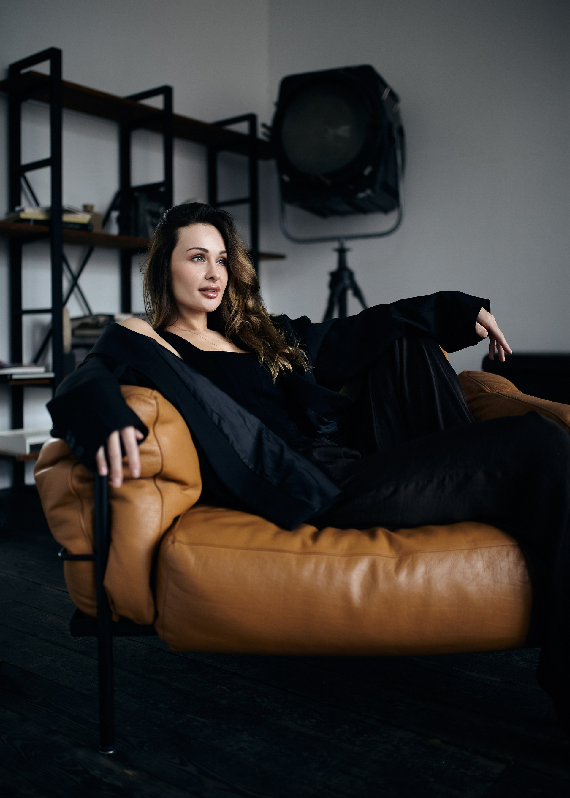 Девушка в черном обтягивающем платье в фотостудии